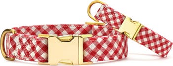 A vibrant gingham pattern with glinting hardware defines a luxe cotton collar that adjusts to perfectly fit your pup.