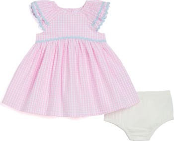 Rickrack trim outlines this cotton party dress made with a sweet gingham print and coordinating bloomers that complete baby's look.