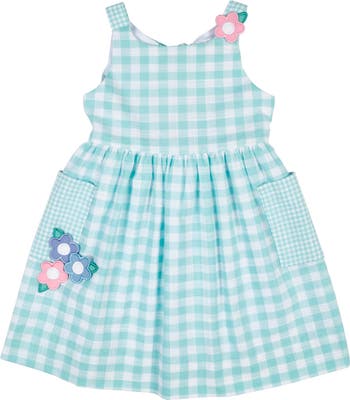 Fresh and full of charm, this dress is crafted from jade and white gingham linen-look woven in a mix of small and large checks for a breezy, textured feel. Appliqué flowers add cheerful color, while a back cutout with a tie brings an airy, vacation-ready touch.\nDesigned with pockets for easy wear, a back elastic waist for comfort, and a softly shirred skirt for movement, it falls to the knee with classic ease. Perfect for sunny outings, seaside dinners, and picture-perfect days away.
