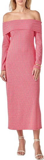 Gingham Long Sleeve Off-the-Shoulder Midi Dress
