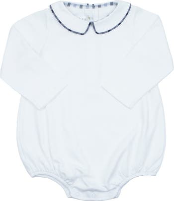 Our gingham piping bubble romper is the perfect romper to wear for this transitional season. This soft, classic romper is made of 100% Pima cotton and features a contrast plaid trim. Suitable for any occasion, this long-sleeved romper is perfect to wear on its own or layered with our corduroy Jon Jon. The front of this bubble is perfect for monograming. The plaid trim detail adds an elegant touch to this classic style. The gingham piping bubble romper has a button closure at the neck and snap opening at the legs. We recommend washing on a gentle cycle and line dry to protect the quality of the outfit.