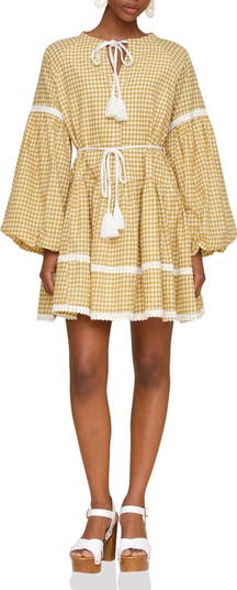 Gingham checks inspired by picnic cloth make a summery splash against this all-cotton minidress edged in pretty lace trim.