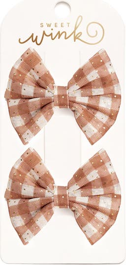- This clip set includes: 2 brown and white gingham tulle bows accented with gold glitter pin dots.