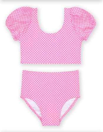 Classic with a playful twist, this bikini features a sweet pink and white gingham print on soft, stretchy tricot. Puff sleeves add a charming, vintage-inspired touch, while a back tie allows for an adjustable, comfortable fit. High-waisted bottoms offer a polished silhouette, and shirred back legs help keep everything perfectly in place during swim and play. Ideal for beach days, poolside fun, and warm-weather getaways.