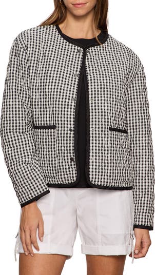 Build out your black-and-white collection with a cute quilted jacket turned out in cheerful gingham checks.