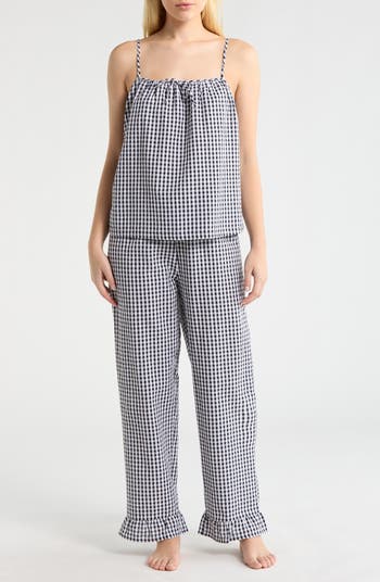 Drift off to dreamland in the breathable, lightweight comfort of crisp cotton seersucker with these nostalgic gingham PJs featuring a cami top and straight-cut pants trimmed in dainty ruffles.