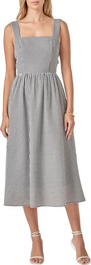 A charming bow drapes over the cutout back on this sleeveless midi covered in cheerful gingham checks and finished with a flared skirt that sways with every step.