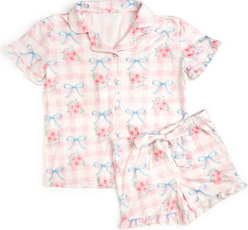 Twirl into wind-down time with this sweet ruffled loungewear set, covered in a playful pink gingham print, pretty florals, and darling blue satin bows. Pair it with the adult version for the sweetest “Mama and Me” matching moment.
