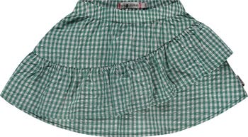 This emerald and cream-toned gingham skirt features an asymmetrical tiered accent and an elastic waistband.