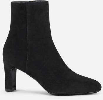 Suede ankle boot with minimalist design. The heel, covered in the same water-resistant suede as the upper, and the inner side zip reflect AGL’s refined craftsmanship.