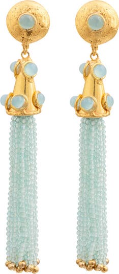 Gold plated brass clip earring "Gio" - Timeless and refined, these clip-on tassel earrings feature radiant gold-tone accents, soft blue gemstones, and cascading strands of calcedoine stones — a graceful blend of elegance and sophistication.