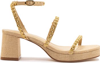 - Step into the warmer months ahead with a chic but chunky sandal that combines all of our favorite elements. Its sturdy square heel offsets thin, barely-there straps on this versatile beige raffia sandal that pops any time of year.