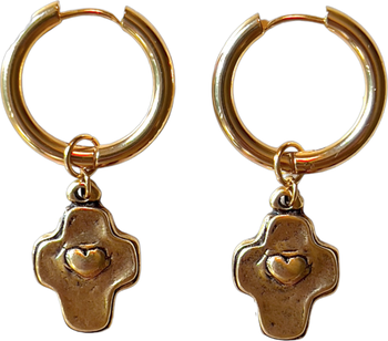 22k gold vacuum plated stainless steel hoops fitted with adorable 12k antiqued gold plated pewter heart cross charms. These earrings can be worn with charms or as plain hoops!