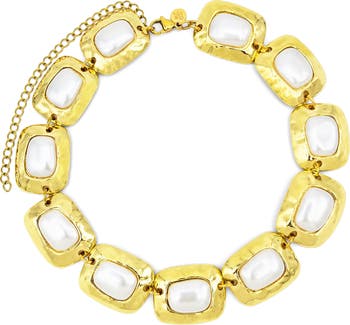 Hammered settings and lustrous faux pearls draw light and eyes to this statement-making necklace.
