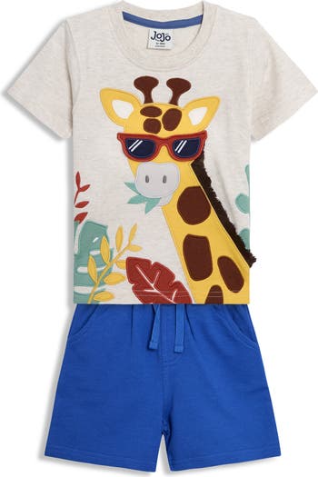 A shade-wearing giraffe snacks on some greens at the front of a charming short-sleeve T-shirt paired with coordinating shorts.