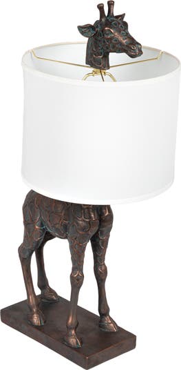 - This whimsical table lamp showcases a resin giraffe silhouette in a distressed finish, topped with a white linen shade