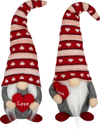 Spread joy and add romance this Valentine's Day with our love gnomes! Adorned in chic gray outfits, and signature pointy knitted hats, paired with adorable red shoes, these charming gnomes will add pops of color and style to your holiday. With bulbous noses, faux fur ponytails, and a beard, they represent gnomes authentically. Holding delightful red hearts that read love, they will add a whimsical touch to any setting. Whether intended as a gift or a delightful addition to your decor, these lovable gnomes will make Valentine's Day truly special. Products Features: Valentine's Day boy and girl gnome figures Wearing red striped knitted pointy hats with hearts Each holds a red heart with the word "Love" Gnomes have long white pigtails, a beard and bulbous noses Hat comes with a bendable wire center, allowing for easy positioning Weighted bottom for stability Recommended for indoor use only Dimensions: 15"H X 4.25"W X 4"D Material(s): fabric/faux fur/wire