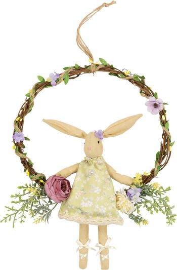 This enchanting wreath captures the essence of the season, featuring a delightful bunny girl at its heart. The wreath itself is a stunning display of natural beauty. Crafted from carefully arranged twigs adorned with rustic jute cord, it evokes a rustic and earthy feel. Each corner of the wreath is accented with an array of vibrant artificial Spring flowers, showcasing the season's vibrant colors. This wreath is a perfect addition to any Easter celebration, bringing a touch of whimsy and beauty to your home Product Features: Floral bunny Easter wreath Designed with twig and jute rope Accented with a girl bunny in a foral dress Embellished with spring flowers No assembly required – wreath comes in 1 piece Comes ready to hang on a jute cord Recommended for indoor use - if using outdoors place under a covered area Dimensions: 10” high x 9" wide (measured from outermost tip/edge to outermost tip/edge across the wreath) Material(s): twig/fabric/plastic/jute