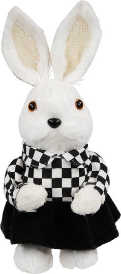 Get ready to hop into the Easter spirit with this charming girl rabbit. Dressed to impress, this adorable rabbit is donned in a stylish black and white dress with a checkered top and black bottom. Complete with her soft, white ears and self standing pose, she's perfect to showcase on a mantel, shelf, or as a centerpiece on your Easter table. Product Features: Easter rabbit tabletop figurine Wearing a black and white dress Ears accented with buurlap insets For indoor use only Dimensions: 10"H x 4"W x 4.25"D Material(s): sisal/burlap/fabric/foam