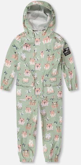 Our rain polyurethane one-piece in green with print turns rainy days into joyful playtime. The color magically changes when it gets wet, while the 3,000 mm waterproof coating and welded seams ensure complete dryness. Featuring a hood, reflective bands, elastic cuffs, and a full-length zipper for easy dressing, this allover printed suit keeps little girls cozy and cheerful under any drizzle.