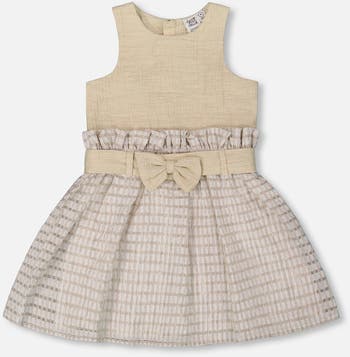 A bow belt adds ultra-girly style to our Bi-Material Belted Dress Beiges. Perfect for any celebration or special occasion, this party dress features a sleeveless bodice with a round neckline, an A-line skirt with a gathered waistband, and a big bow belt that makes it super sweet.