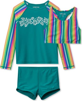 Chlorine-safe coverage fun pool days. Keep her protected and comfortable all summer long in our chlorine resistant 3-piece swimsuit set. The long sleeve rash guard with lined front pairs perfectly with boyshort bottoms for extra coverage. Made with durable polyester-spandex blend that stands up to pool days.