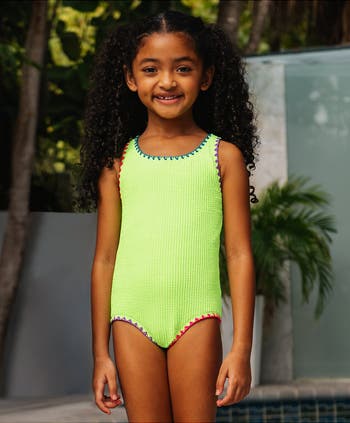 This one-piece bathing suit features a classic silhouette with a racerback and textured fabric for extra style. It's crafted with our signature swim fabric, which means it has UPF 50+ and is chlorine resistant so she can wear it over and over and swim with ease.