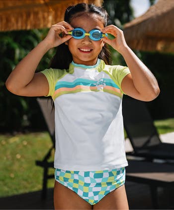 Two cute looks with extra coverage. Our three-piece swimsuit set gives girls two looks in one with a chlorine-resistant design that lasts all summer. The short sleeve rash guard provides sun protection, while the reversible high-waisted bikini bottom offers extra coverage with vintage flair. Ruched details add a stylish touch.