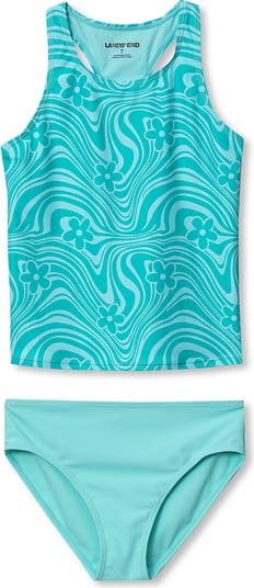 This fun two-piece bathing suit features a racerback tank crafted with fun summery prints she'll love, and a solid color bikini bottom to match. Perfect to pair with her favorite sandals and beach cover-up, this lightweight tankini will take her seamlessly from beach to pool.