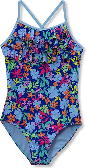 Cross-back support with sweet ruffles. Our new Girls Chlorine Resistant X-Back Ruffle One Piece Swimsuit combines style and practicality. The pretty ruffle front (with foil detail in select colors) pairs with secure cross back straps for extra support. Plus, the improved fit offers better coverage while she splashes and plays.