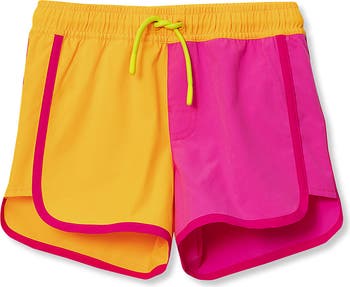 Colorblock shorts for easy water play. Our Girls Colorblock Board Shorts feature a new woven design with pull-on elastic waistband for easy dressing. The faux fly adds style while the built-in panty lining provides extra coverage for active days. Comfortable and practical for all her water adventures.