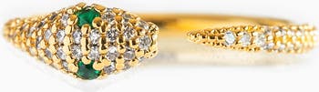 Cubic zirconia pavé brings scaly texture to this open snake ring detailed with gleaming green eyes.