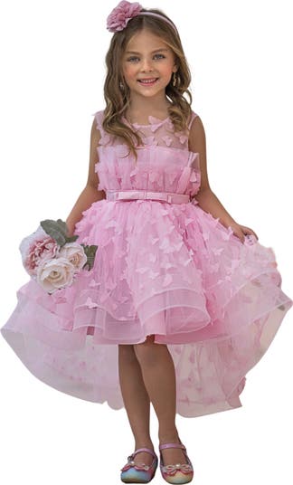- Pink tulle dress with butterfly appliqués, sleeveless sheer bodice, hi-lo hem, and belt detail