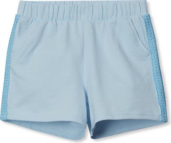 Soft, breezy comfort for sunny days. These comfy French Terry Pull On Shorts feature an encased elastic waist for easy on-and-off. Made from our soft cotton blend fabric with functional front pockets and pretty crochet side taping, they're perfect for everyday adventures. The 3.5" inseam provides just-right coverage for active girls.