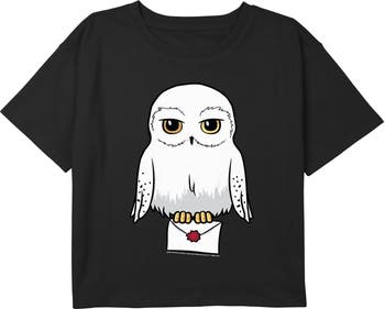 - Strut your stuff with this stylish new girls' cropped t-shirt that is perfect for every occasion! Featuring the snowy white owl, Hedwig, as a cute cartoon holding a letter on the front.