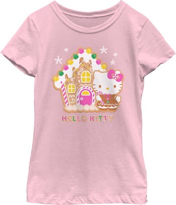 - Show off your impeccable taste with this stylish new girls' t-shirt that is perfect for every occasion! Featuring Hello Kitty next to a gingerbread house printed across the front.