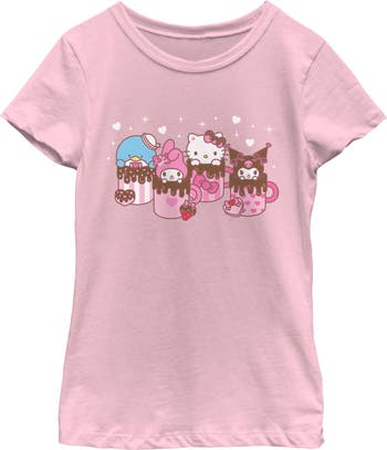 - Show off your impeccable taste with this stylish new girls' t-shirt that is perfect for every occasion! Featuring Hello Kitty and friends in pink cups printed across the front.