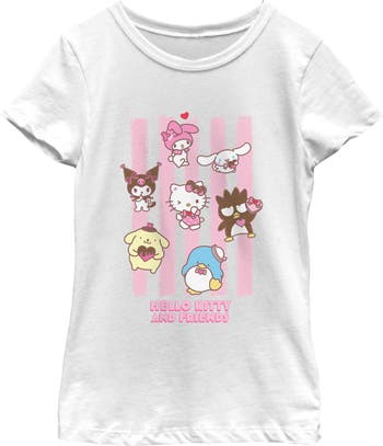 - Show off your impeccable taste with this stylish new girls' t-shirt that is perfect for every occasion! Featuring Hello Kitty and friends with pink stripes in the background.
