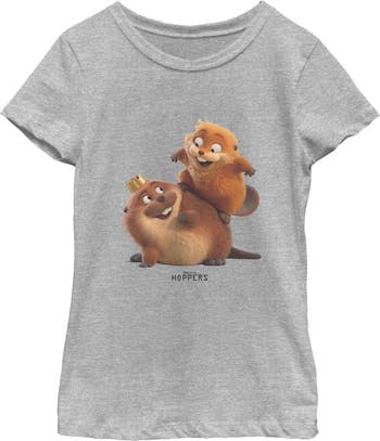 Run! Crawl! Swim! Fly! Meet this new officially licensed Hoppers graphic tee you didn't know you needed but absolutely do, inspired by the all-new Disney Pixar movie! This unique Girls' King George and Mabel Fun Graphic T-Shirt features Mabel happily perched on King George's back, with the official movie logo beneath them. Don't miss out on this incredible apparel. Grab yours today and carry a sprinkle of Hoppers magic wherever your journey takes you!