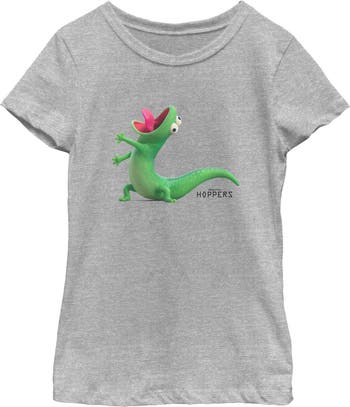 Run! Crawl! Swim! Fly! Meet this new officially licensed Hoppers graphic tee you didn't know you needed but absolutely do, inspired by the all-new Pixar movie! This unique Girls' Hoppers Tom Lizard Celebration Pose Graphic T-Shirt features a large, full-color print of Tom Lizard with his mouth wide open, yelling in pure excitement next to the official movie logo in bold black. Embrace your inner lizard-lover and grab this fantastic Hoppers apparel today!