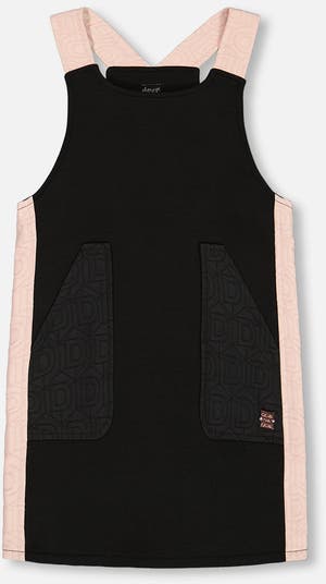 Detailed with contrast pink side panels and straps, our Jumper Dress with Contrast Band Black is easy to dress up or dress down. This sleeveless jumper features wide straps with D-stitched details, a round neckline, and pink side panels for added contrast. Two front pockets add the perfect finishing touch!
