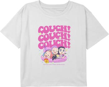 Prepare for debut with these incredible designs from the new, top-charting Netflix Film: K-Pop Demon Hunters! Dance to Soda Pop or Takedown with this Girls' Cute Friendship Idols Couch Time Time Graphic Cropped T-shirt featuring Mira, Rumi, and Zoey sitting on a couch having a movie night and eating snacks, and the text "Couch! Couch! Couch!" in bold pink lettering in the background. These designs are going to be everything you can think of, so gear up to take all demons down while looking like the greatest idol the world has ever seen with out-of-this-world, officially licensed K-Pop Demon Hunters apparel!
