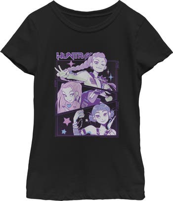 - Unleash your inner idol with this eye-catching girls' t-shirt perfect for concerts, hangouts, or everyday slaying! Featuring Rumi, Mira, and Zoey in a cartoon style and the HUNTR/X logo printed across the front.