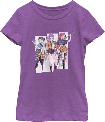 - Unleash your inner idol with this eye-catching girls' t-shirt perfect for concerts, hangouts, or everyday slaying! Featuring anime-style panels of K-pop Demon Hunter's main characters printed across the front.