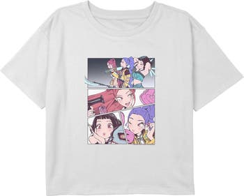Prepare for debut with these incredible designs from the new, top-charting Netflix Film: K-Pop Demon Hunters! Dance to Soda Pop or Takedown with this Girls' Huntrix Idols Manhwa Panels Graphic Cropped T-shirt featuring colorful, anime-style depictions of Huntrix's members Rumi, Mira, and Zoey, placed in several irregular panels. These designs are going to be everything you can think of, so gear up to take all demons down while looking like the greatest idol the world has ever seen with out-of-this-world, officially licensed K-Pop Demon Hunters apparel!
