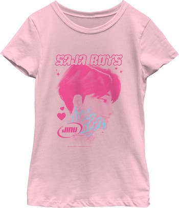 - Unleash your inner idol with this eye-catching girls' t-shirt perfect for concerts, hangouts, or everyday slaying! Featuring a pink portrait of Saja Boys' leader Jinu printed across the front.