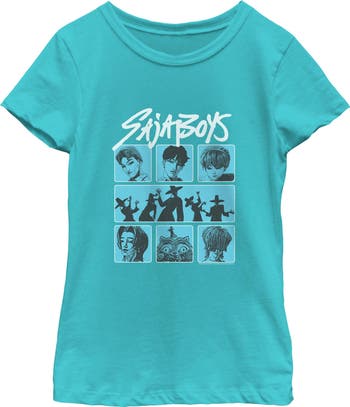 We're going up, up, up, and these trendy designs from the new animated film K-Pop Demon Hunters won't stay behind! Whether you're a demon hunter or a regular idol, you can't go wrong with this Girls' Saja Boys Group Graphic T-shirt featuring blue panels forming a square with all Saja Boys' members including their demonic alter egos plus Derpy and Sussie on the bottom center. All this under the band's logo in solid white. Get golden to conquer the Idol Awards and embrace your true self to show the world how it's done!