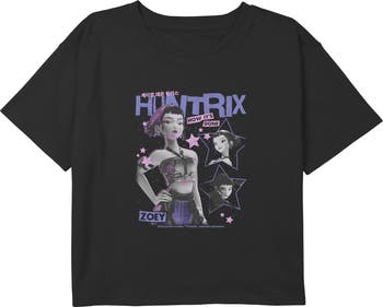 Prepare for debut with these incredible designs from the new, top-charting Netflix Film: K-Pop Demon Hunters! Dance to Soda Pop or Takedown with this Girls' Show How It's Done Zoey Stars Graphic Cropped T-shirt that features Zoey with some portraits of her framed by stars, the quote "How It's Done" and the band name "Huntrix" in bold purple lettering printed above. These designs are going to be everything you can think of, so gear up to take all demons down while looking like the greatest idol the world has ever seen with out-of-this-world, officially licensed K-Pop Demon Hunters apparel!