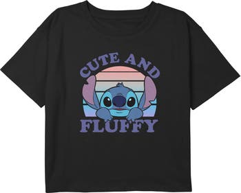 - Strut your stuff with this stylish new everyday girls' cropped t-shirt that is perfect for every occasion! Featuring Stitch with a sunset in the background and the phrase: "Cute and Fluffy" in purple across the front.