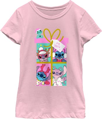 - Strut your stuff with this stylish new Christmas girls' t-shirt that is perfect for the holidays! Featuring Angel and Stitch dressed up in cozy clothes inside a present for Santa Claus.